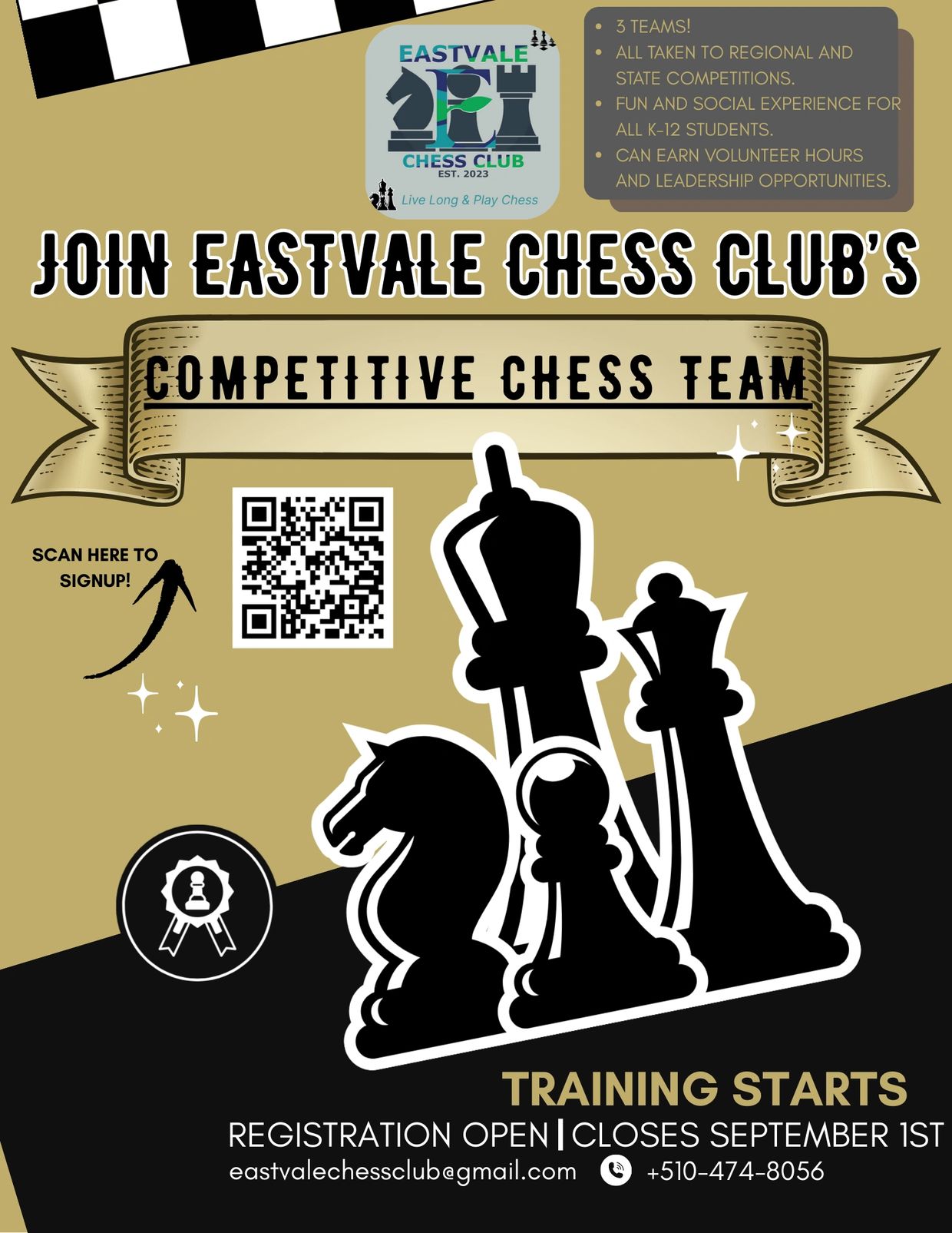 We are proud to introduce Eastvale Chess Club's competitive chess team for all student's in K-12. The intent of this program is to provide our city's youth an opportunity to play and improve their chess skills in a social, fun, and memorable way. This program will have 3 teams, an A, B, and C team where players are selected into their respective team based on their application and skill level. A represents advanced level while C represents beginners who are just getting into chess! These teams will give selected members great opportunities for leadership opportunities and volunteering hours. Most importantly, the members selected to be a part of our club's 3 teams are the individuals that will be representing our club when we compete regionally and at a state level. Everything is completely free of cost!